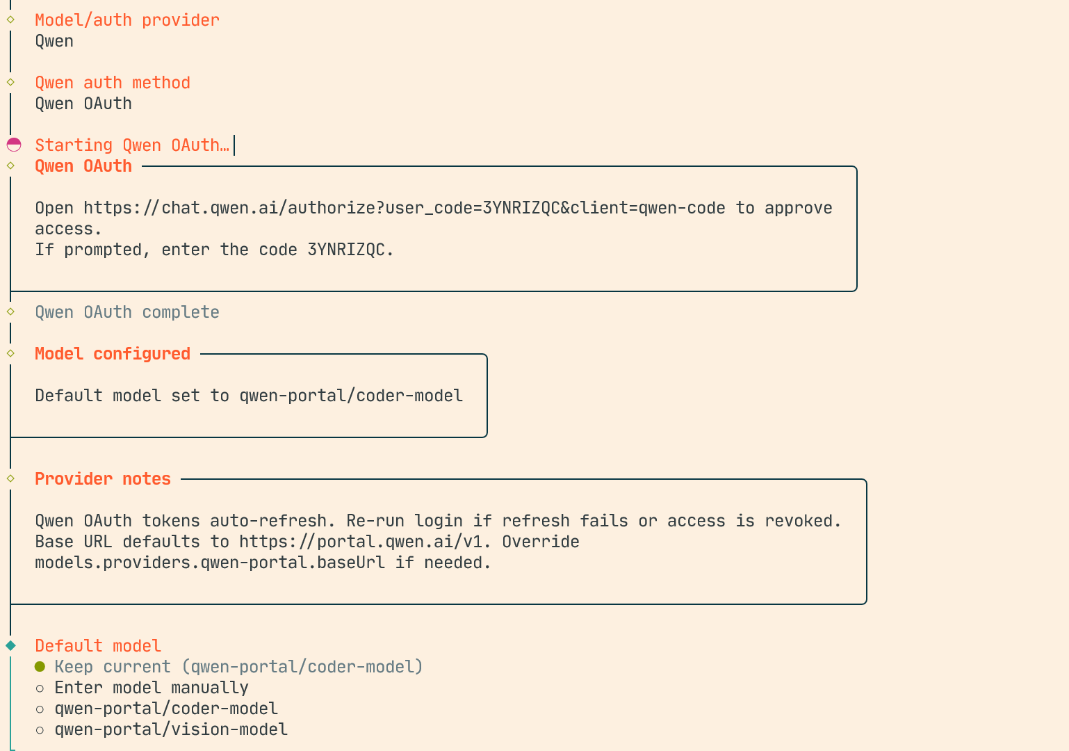 这里会需要我们配置一个大模型,Model/Auth Provider 选择 AI 供应商,我这里选择的是阿里的Qwen.当然,你可以根据你的需要选择你需要的大模型提供商