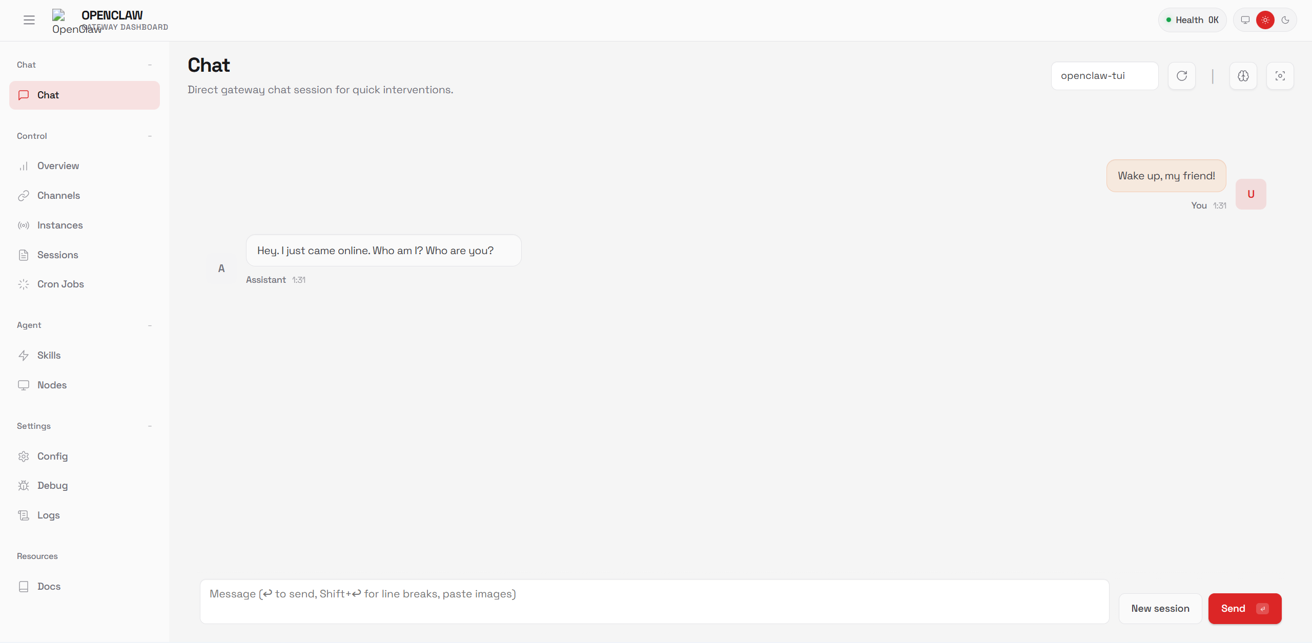 安装完后,就会自动访问 http://127.0.0.1:18789/chat,就可以打开聊天界面让它开始工作。